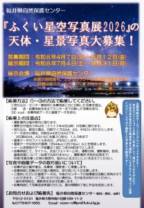 令和元年度~7年度に開催した「ふくい星空写真展」では、県内の各地で撮影された作品を多数ご応募いただきました。美しい星空の写真は、多くの来館者の方々に大好評でした。そこで令和8年度も引き続き「ふくい星空写真展」を開催します。