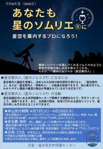 ◆:福井ライフ・アカデミー連携事業 ●:CST(福井大学)対象講座令和8年度星空案内人(星のソムリエ®)の資格認定講座の申し込み受付が、4月7日(火)から始まります!令和3年からスタートしたこの講座も、6年目を迎えます。当センターでは、これまでに星空案内人27人、星空案内人(準案内人)88人が認定されました。